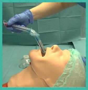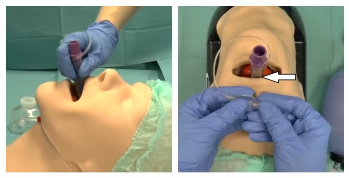 Slid down device until resistance is felt. In correct size, upper incisors fits black lines on tube.